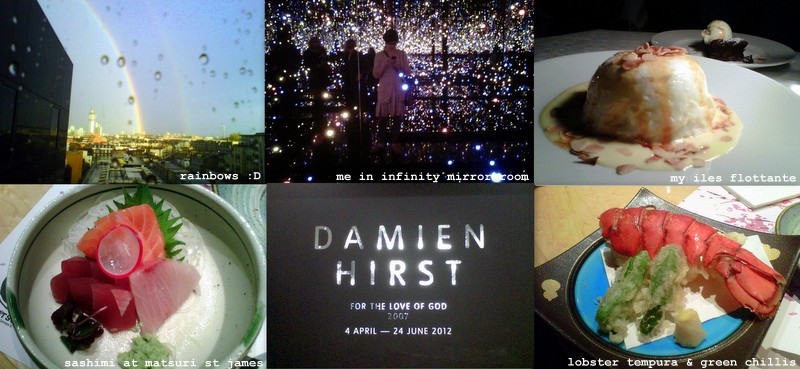 The weather did not preclude me from my planned trip to the Tate Modern, and everybody ought to go and see Damian Hirst’s ‘For The Love Of God‘, the platinum-plated and diamond-encrusted skull pictured last week – no photograph on earth could do it justice (not that I got the opportunity to test the theory, since cameras are strictly prohibited); sparkly, shall we say. I also wandered through the rest and even had time for a whizz round Yayoi Kusama (see above) plus a brief pit-stop in the Member’s Room for tea and a biscuit, thanks to a not-entirely-unwelcome cancellation on Friday afternoon; coincidentally about the only time when it stopped pissing down for more than ten minutes.