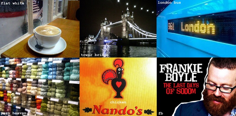 Any time spent with Frankie Boyle (an angry man, Nando’s or no Nando’s) calls for calming measures to be taken, and after some early doors shenanigans with more London folk on Sunday morning I packed up, checked out and strolled over to Sloane Square to give myself up to the warm and peaceful embrace of the Peter Jones haberdashery department, where I drifted about in a yarn-induced stupor for nigh on forty minutes, eventually departing with as many bagfuls as I could carry as well as assorted beads, a giant (10mm) crochet hook and some previously untried and supremely lethal-looking 4mm bamboo knitting pins which will not only make sustained knitting sessions (Glasgow-Scarborough, Cork-Dublin, anything involving National Express) gentler and easier but should also come in handy in the event of a mugging attempt.