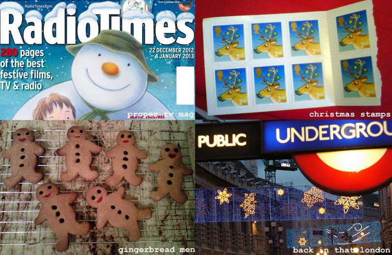 My elderly (in it’s nineteenth year anyway) artificial tree was hunted down in the loft after a brief panic at the news that there were to be no deliveries from the Little Tree Company this year (virus?) and is proudly gracing the front room in all it’s sparkly and fabulous glory for the first time in five or six years, the side with a branch missing discreetly turned to the back. Proper gingerbread men (with currants, NOT bloody Smarties) have been mixed, trial-runned (ha) and the dough – at least that which wasn’t either baked or just eaten raw – stashed in the freezer for when I get back along with bread sauce, fishcakes and pairs of bacon rashers. Finally, the most hallowed tradition of buying the Christmas TV guide has been accomplished after two attempts, my having decided for the first time ever to skip my usual Radio Times at £2.80 and settle for a 90p one with people from soap operas on the cover instead, only to have to return it in disgust half an hour later. I wonder if people often take TV guides back to exchange them for another on the grounds that they are crap?