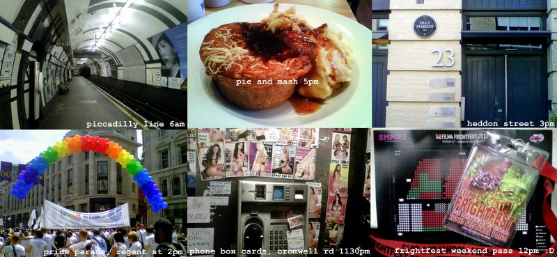 I followed this by inadvertently getting caught up in London Pride (not the Fuller’s one) as the parade went down Regent Street and intersected my route to Heddon Street, where I had promised myself (and after another visit to David Bowie Is at the V&A followed by a Thai banquet with a gentleman of long acquaintance who gallantly pretended not to notice that I was not only slightly mental, but had practically forgotten how to sit at table and eat with cutlery from a plate like a civilised adult) that I would visit the Ziggy Stardust plaque at number 23 unveiled last year at the site of the original cover photograph to mark the forty years since it was taken in January 1972, when Heddon Street was a Soho back alley rather than somewhere (else) for Strada to punt a bit more overpriced foccacia to unwary tourists. Needless to say, an hour and a half or so later having finally made it I’d had more than enough of being stood on, and spent the next hour first getting as far away as possible before finding a quiet corner for some pie and mash.