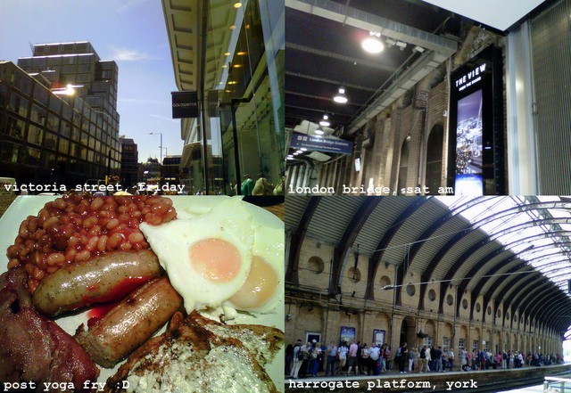 For those in the yoga-know, I managed Dancer pose on both left and right sides without falling over for the first time ever and this prompted a mini-celebration by way of a full English with tea and real sugar on the way back across town to pack up and set about getting home, fortunately without too much of a scrap at York (although the easily-avoided Harrogate platform was still three deep with those off to catch the end of the Grand Depart) in good time for the football; by way of a sidenote I can highly recommend the huge kebabs from La Plaza on Falsgrave Road, ordered as emergency measure when extra time became apparent, delivered promptly and to the door in twenty minutes or so without any whiny phone calls, and about as good a kebab as I suspect anybody has ever had.