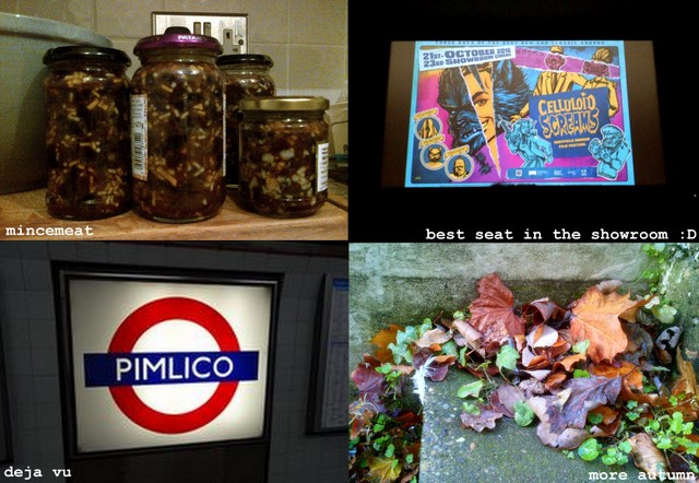 The quest to fully stock the chilly cupboard in the hallway with Christmas food continues apace, its shelves now including chocolate, pretzels, nuts, crackers and Twiglets as well two and a half Christmas cakes – why is nearly all Christmas food brown? Mincemeat was next on the Home Made list and I managed to get through the whole task without picking (eating the stuff raw is a step too far even for this lifelong suet devotee) or making a mess, and puddings will follow next weekend to coincide with yet more painting of woodwork in the four or five hours of daylight available. Fingers crossed the former will triumph in the Battle Of What The House Will Smell Like.