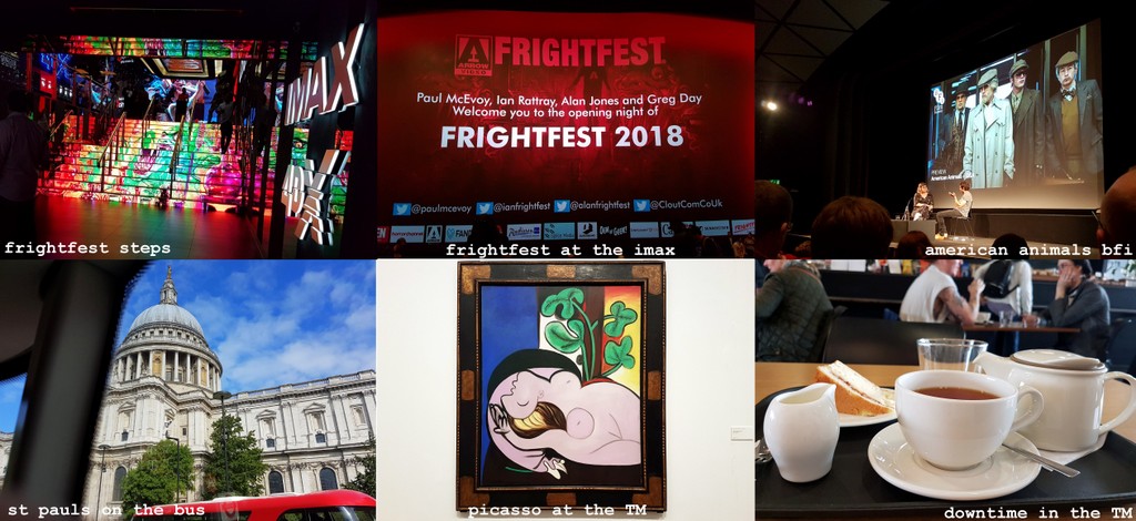 I think the South Bank is possibly my favourite part of town for a brief visit and thankfully the local populace agreed it was a good idea – there was no letup even after I checked out in the form of a rare outcall to a nearby hotel, which kept me enjoyably busy and out of mischief until FrightFest arriving time at 5 o’clock. I couldn’t stay away from the riverside even after upping sticks and moving over to Aldgate for the weekend, and had a gentle Saturday afternoon stroll along to the Tate Modern and back for Picasso and a brew rather than hang about for a random mid afternoon screening that I can’t even remember. That said, the daily ride into town on the 15 bus from E1 was a highlight all by itself (as is any bus ride if you are me, to be fair) and I won’t leave it so long next time.